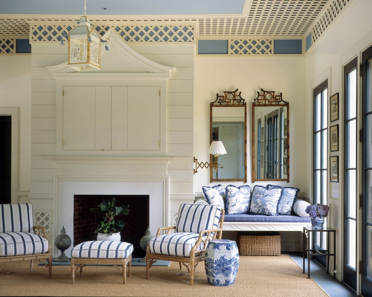 Fall might be just around the corner but summer’s not over yet! Ahhhhh, summer... sunny days and laid back, effortless style. As we savor the last summer days of the year, take a look at this fireplace from the pool house at Blue Ridge Farm in Albemarle County, Virginia. (Yes, I said “pool house”!) The crisp blue and white color palette, natural fiber rug, and clean white walls all work together to give this room a fresh, natural feel. When you think of summer style, think rattan, wicker, bamboo, and weathered wood. These elements can be used throughout the year and even if you don’t have a pool house or live near the beach, you can use these elements to give your home an airy feel. I like how this fireplace is painted. Shades of white and cream give the surround and the mantel a fresh look. A simple plant in a ceramic pot placed in the firebox with matching urns on either side of the hearth adds to the fireplace’s classic charm.